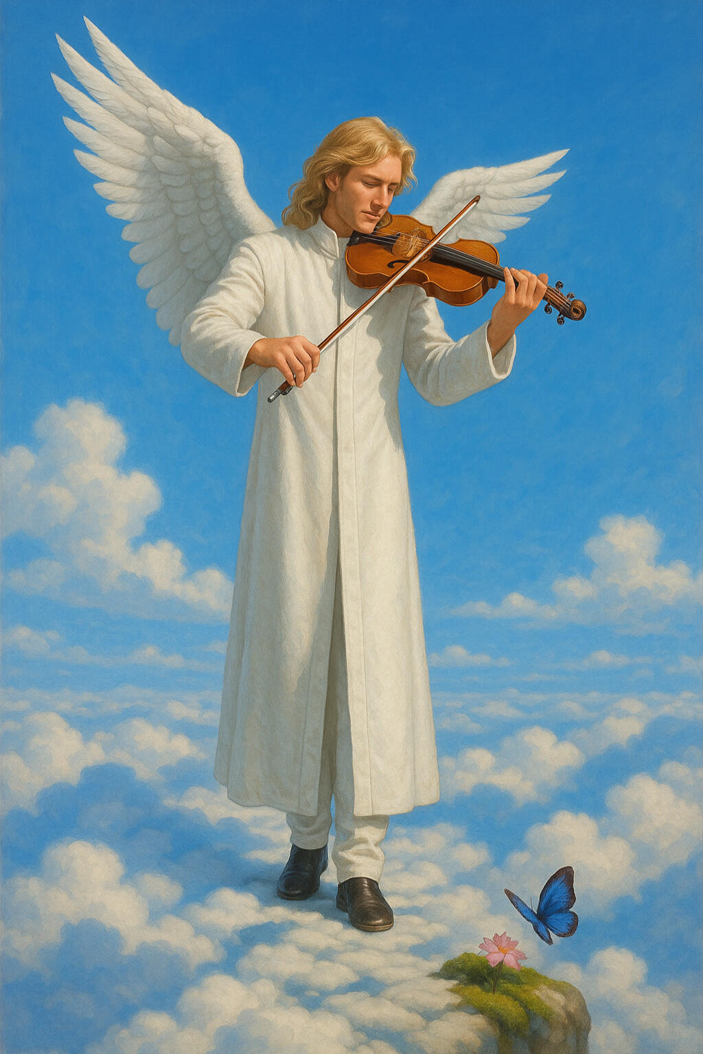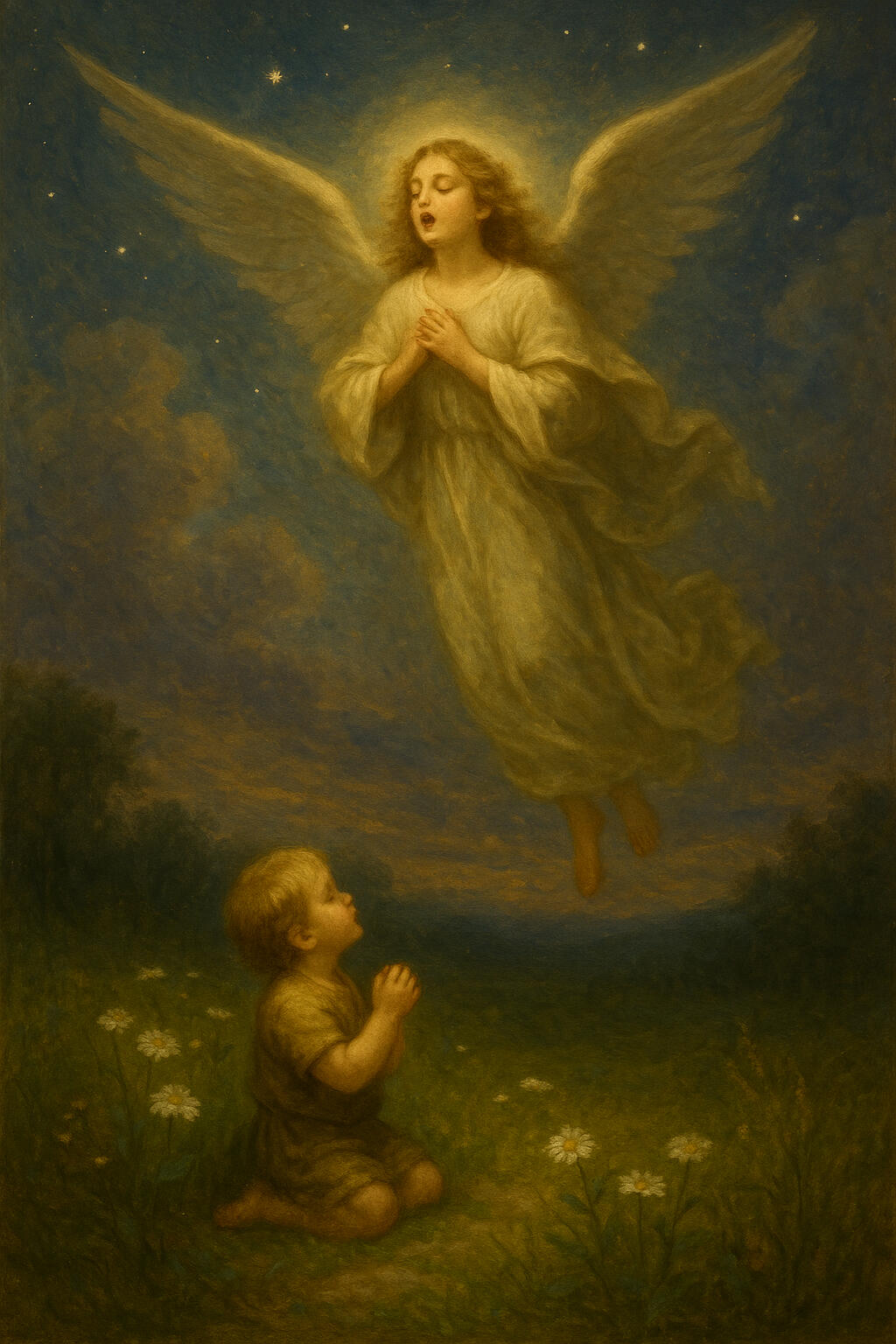 A classical child’s angel sings gracefully in the sky, bathed in soft silver light.Her flowing robes ripple as if falling upward from the child’s eye into the starlit sky, and she leans forward in gentle song — her voice imagined as descending on the breeze.Below, a child with hands in prayer, the angel a memory of ancestors, in the meadow with wildflowers — the scene from heaven to earth.The atmosphere feels sacred, serene, and protective — as though her song is a blessing poured over the world.